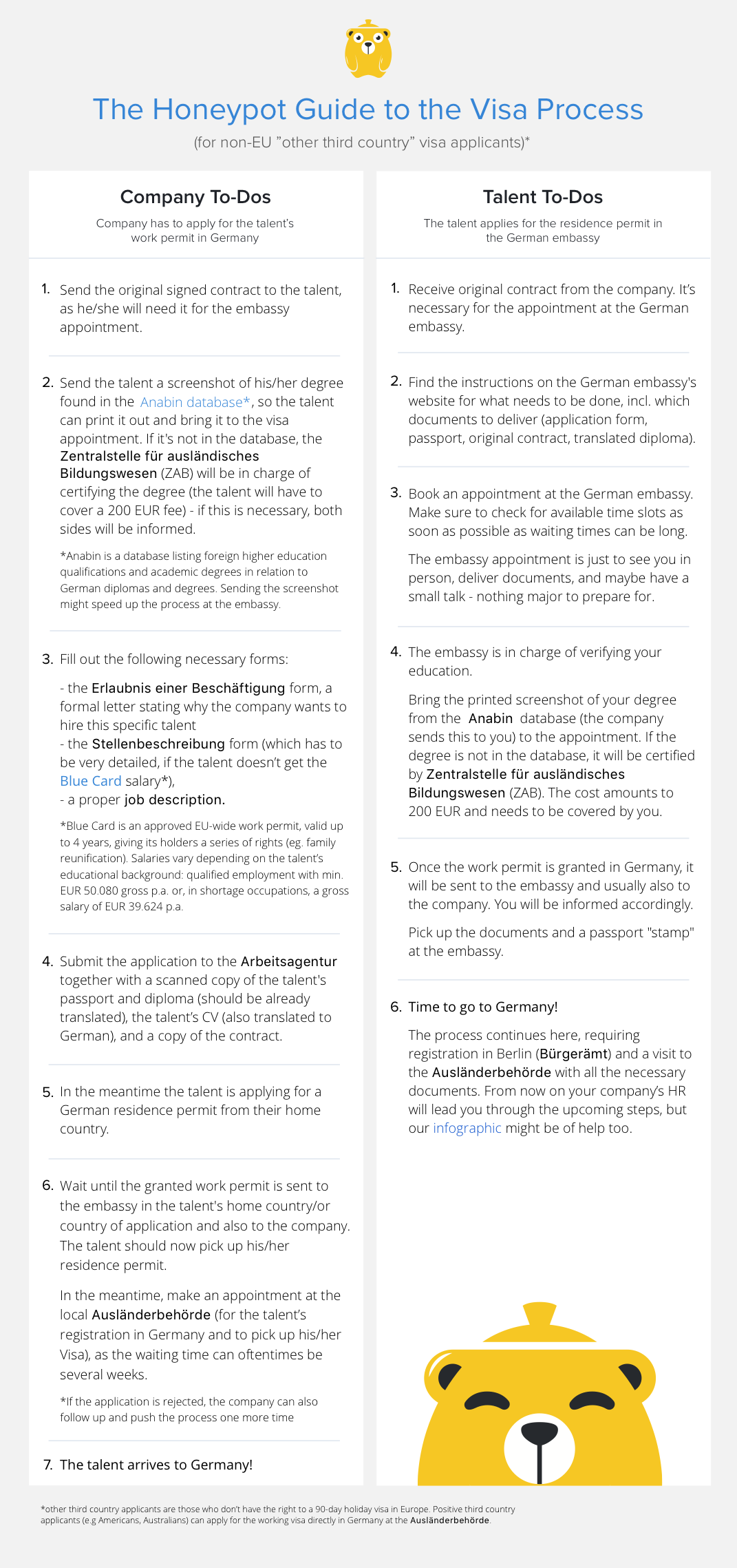 Honeypot offers free visa support for all non-EU developers hired in Germany through our platform. We believe that for European tech hubs to be great, they need to compete on par with San Francisco in terms of talent attraction. First step is to know all about the visa process here in Germany.
